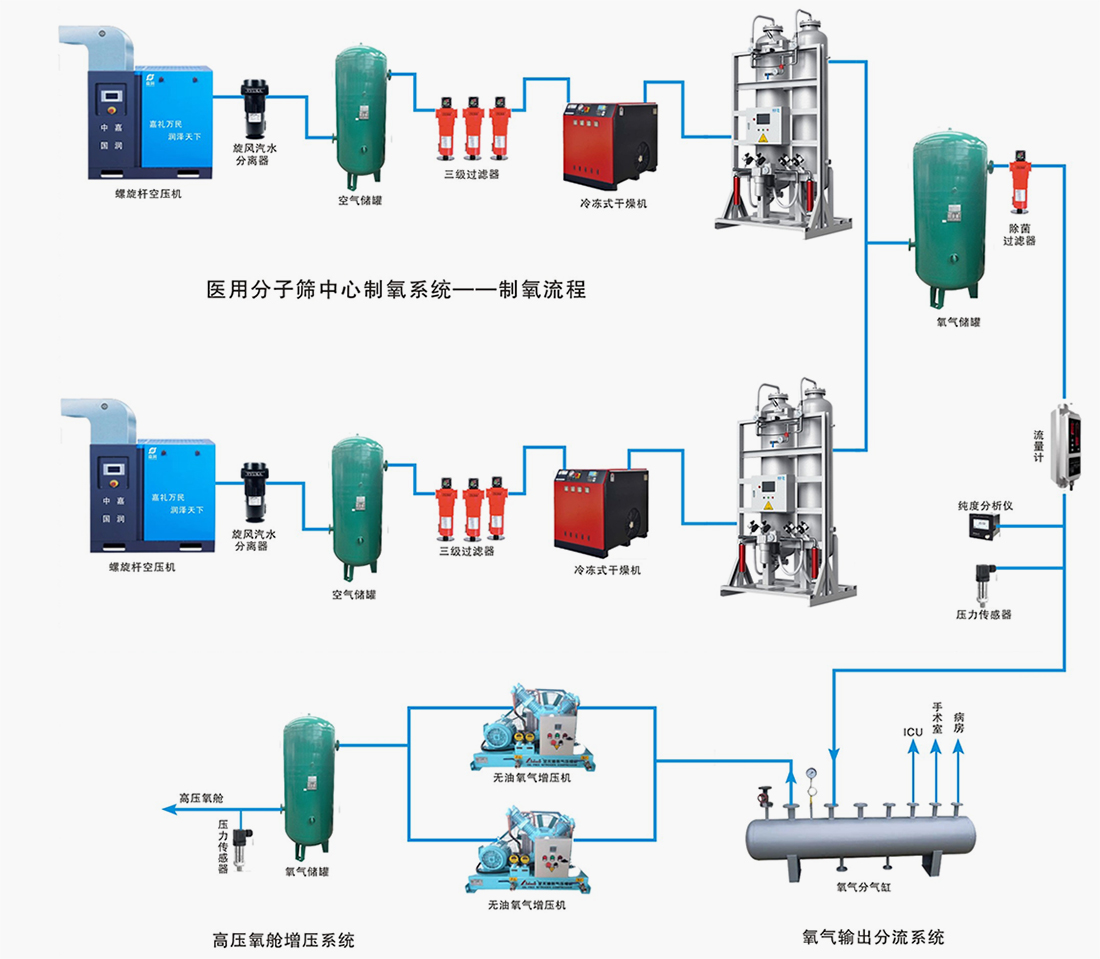 本制氧系统组合灵活,可单台加装供氧装置单独使用,也可以多台组合通过控制系统通过中心供氧管道对全院供氧,满足医院普通病房,手术室,ICU等场合使用。
